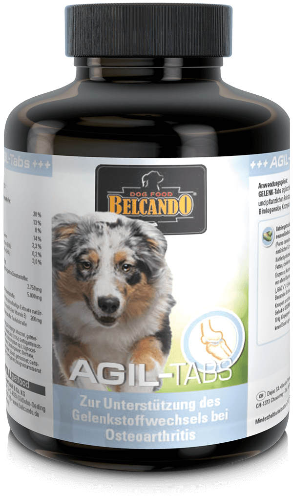 BELCANDO® AGIL-Tabs complementa a dieta do seu cão com nutrientes provenientes de frutos do mar e plantas conhecidas pelos seus efeitos no tecido conjuntivo, cartilagem e função articular.